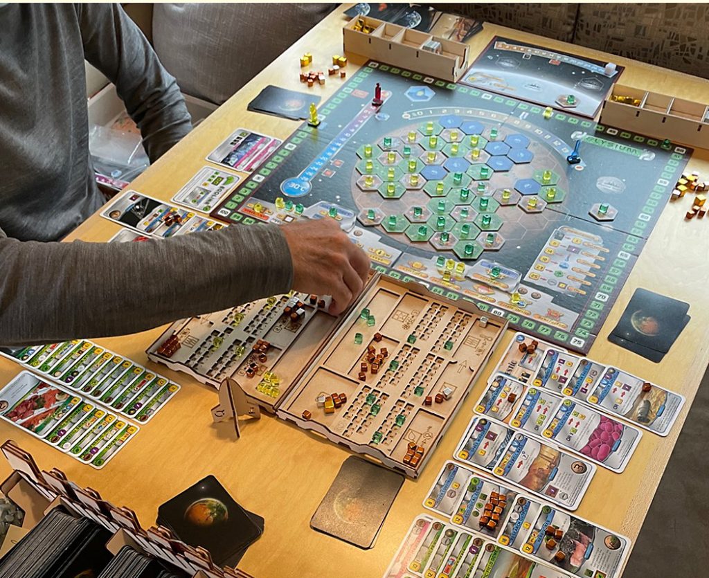Gary Gagnon playing Terraforming Mars in their RV, where they often play games on rainy days or in the evening.