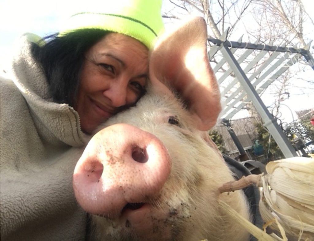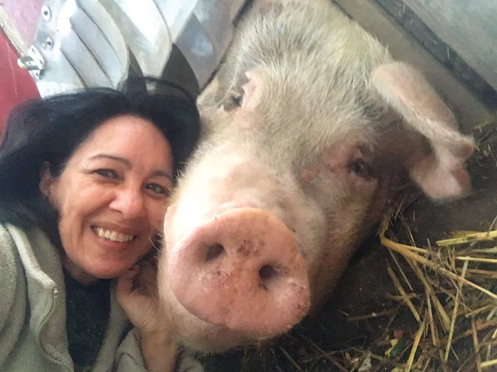 “It’s changed me,” Lisa says. “In so many ways. Not just with pigs, but with other intelligent beings that have emotional responses that really you can see. But I don’t run around on my soapbox trying to change people,” Lisa adds. “I don’t talk about it. I don’t want to be that woman—‘Oh, there’s that lady with the pigs who’s gonna to try and get you to stop eating bacon.’ I don’t wanna lose friends over this—or family! I mean, my God, my stepmother used to get us up on the weekends by cooking a pound of bacon, and we were like, ‘Ooooohhhh, bacooonnnn.’ My sister and I would get outta bed like zombies heading towards the bacon. And when we got Rudy, there was carnitas in my freezer.
