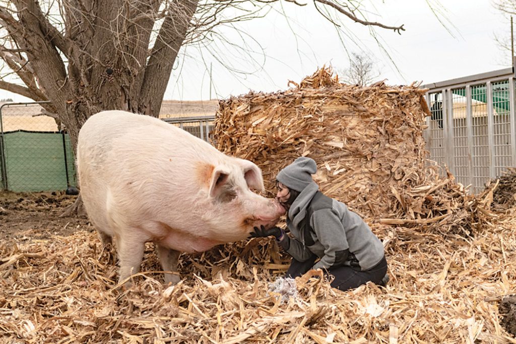 “When Rob was young, growing up here in Iowa, he worked on these farms and he would castrate or neuter these pigs without any anesthetic or whatever—it’s just what they’d do. And so it really surprised me that he went out of his way to save this one little pig on the highway. But he did it. And now he loves her, too. I mean, he’s the one who buys her all these bigger houses,” she chuckles.