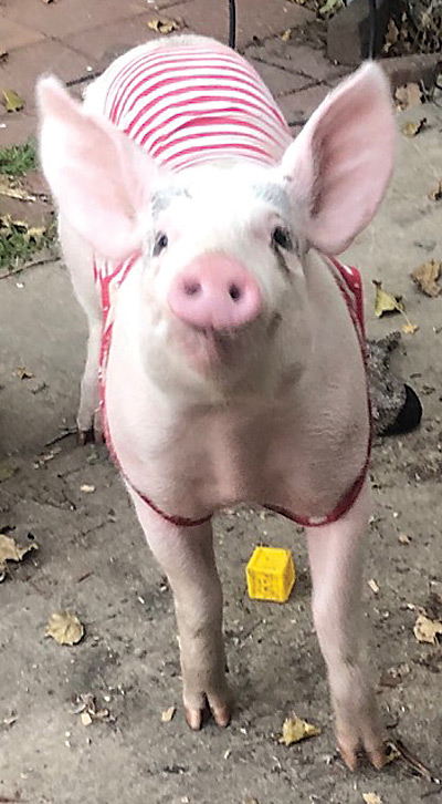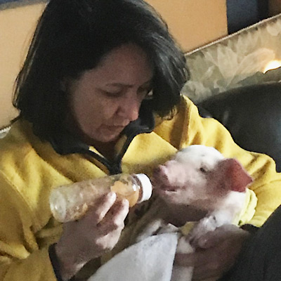 Life was tenuous for little Rudy, who for a time refused food and water. “What did I know about pigs? Absolutely nothing!” Lisa said. “I’m from Chicago—the closest I ever got to a pig was the Lincoln Park petting zoo!” But as with most things, Lisa was undeterred. Not afraid of research, nor too shy to ask for advice from her veterinary friend at the University of Illinois, Lisa was soon making progress with bottle-fed pureed food, and a few days later, tiny Rudy started eating by herself out of a bowl. Recovery was underway, and a great love story had begun.
