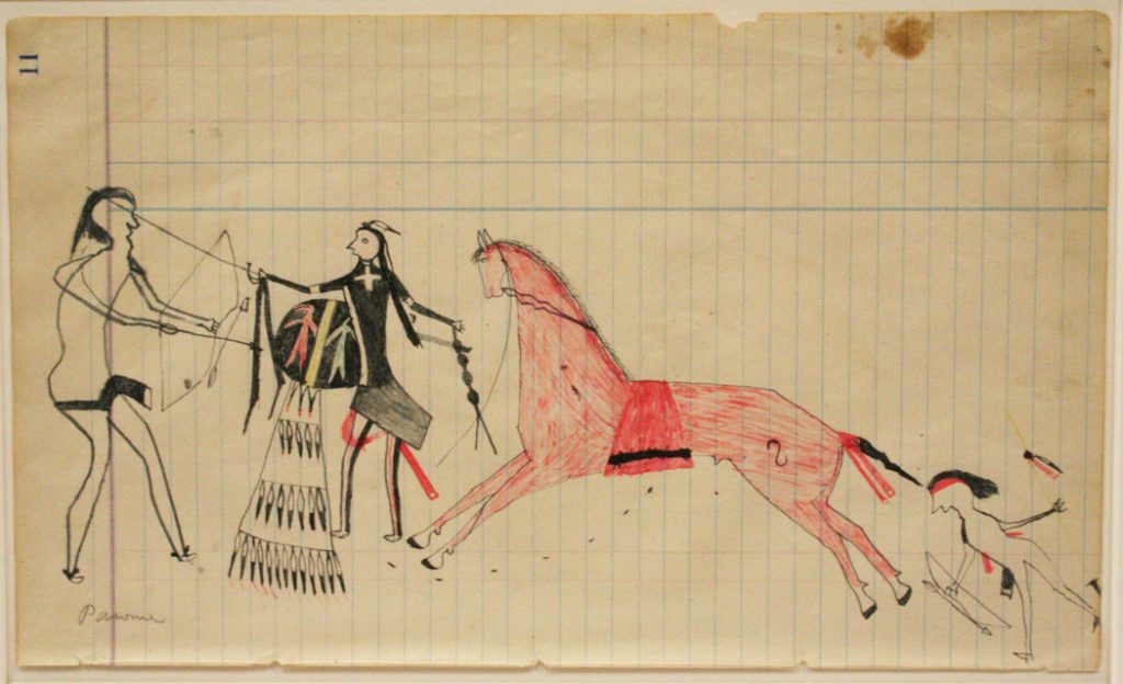 Ledger drawings evolved as an outgrowth of the Plains men’s tradition of hide painting—keeping visual records of tribal stories, achievements, and events on beautifully painted buffalo hides, using a visual language that includes pictographic “name glyphs” and detailed regalia that was easily understood by community viewers. After the U.S. invasion of the Great Plains, the men shifted to using paper from accounting ledgers. This exhibition displays some of the most famous ledger drawings—a selection of pieces created by a group of Plains men who were incarcerated for three years at Ft. Marion in St. Augustine, Florida, from 1875–1878, after the U.S. used accounting ledgers to document them, incorrectly, as criminals. The men were encouraged to sell their work, and ledger drawings became a hot 19th-century art commodity.
