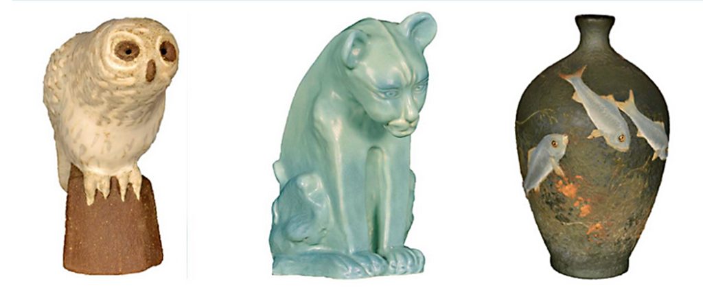 “Muscatine Art Center staff selected examples of larger garden ware, vases, other vessels, and smaller objects,” explains Alexander. “Each person on staff has a few favorites, like the gardenware swans that measure about 18 inches, or the highly decorative vases that feature fish or owls. There is something for everyone among the examples of art pottery.”