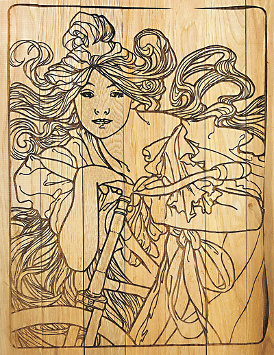 A comfy, colorful reception area showcases some of the pieces created at the Fab Lab, including a stunning wood-engraved master copy of Alphonse Mucha’s Cycles Perfecta. This room leads to the Print Shop, tucked off to the right, supplying the set-up for five-color screen printing. Custom t-shirt or yoga mat, anyone?