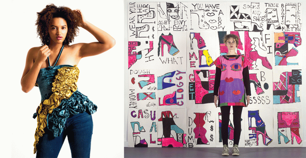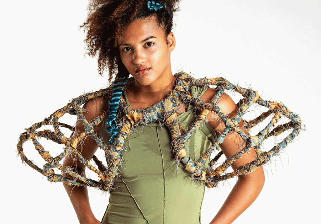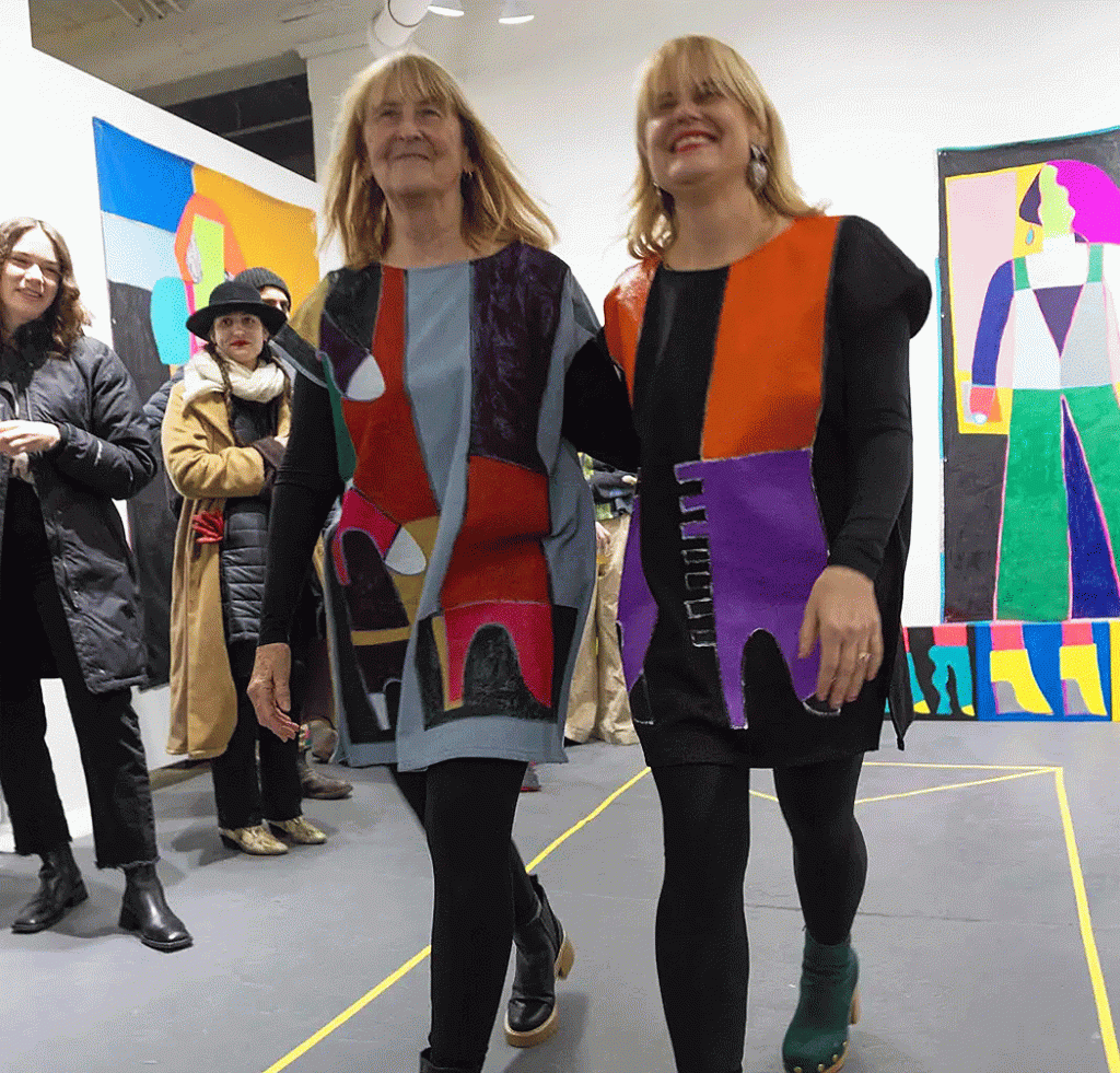 Both Kathleen and Gyan Shrosbree use traditional painting materials in their creations. Painted canvas becomes sculptural fabric pieces that “can be activated by the body and take new shape,” Gyan says. These are “paintings that move and inhabit spaces on bodies,” merging strands of fashion and visual art into something new and interactive.