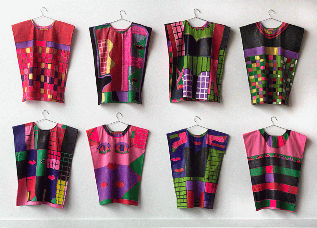 “Color is very important in my work for many reasons relating to color interaction, as well as creating energy and moving space,” Gyan says. “Color that is so bright invites the viewer in to take a closer look and keeps the viewer at a distance because of its intensity. Color acts as a protector in this way. I think of clothing as armor, giving both power and protection. Many of the tunics in this collection are heavily layered with paint, creating a rigidity akin to armor. These two qualities—protection and armor—give rise to the concept of the tunics as ‘power suits.’”