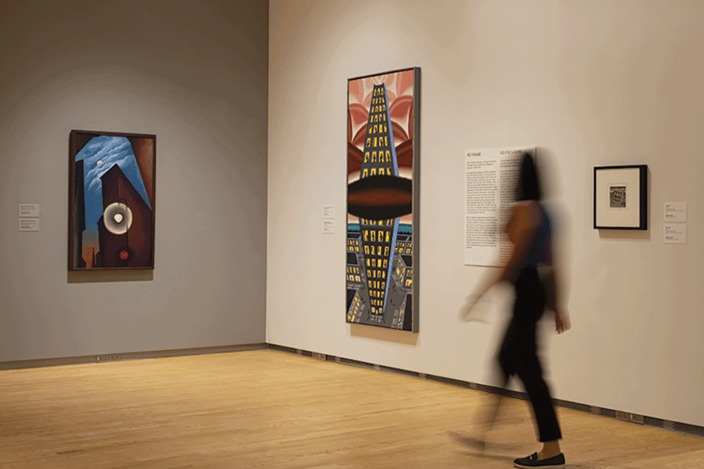 Tuite feels the paintings make a wonderful pair. “It’s a fun thing to have an exhibition in miniature, with just a few works of art.” This mini-exhibition also helps introduce a new series the Stanley has begun, called Re/frame, which invites viewers to look at works in a new light, examining how contemporary and historic works speak to each other. Seen together, O’Keeffe’s and Brown’s different interpretations of urban landscapes create a dialogue on how images of the built environment can both express and critique ideas about American progress.