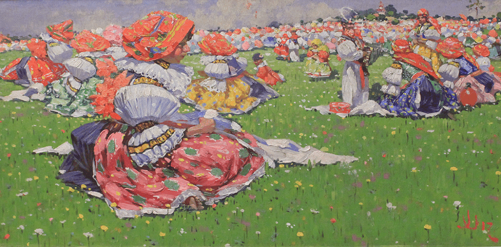 Now on view at the National Czech and Slovak Museum in Cedar Rapids, the untitled circa 1917 painting is one of over 120 other works by Uprka in The Soul of Moravia: Joža Uprka Reprised. Uprka is known for his richly detailed depictions of Moravian folklore, rural life, and spiritual traditions at the turn of the 20th century. The colorful paintings of women and men blend academic technique with Impressionist influences to immortalize the customs and folk dress of his native region. th color and nods to Moravian traditions and heritage.