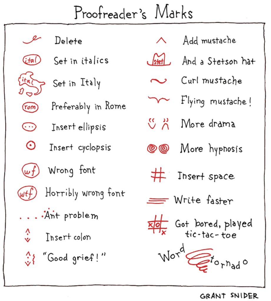 Everything I knew about proofreading I’d learned from my father, who’d critiqued my middle- and high-school papers with a red pen. Annoyed by the corrections, I was still fascinated by his little red strokes and slashes, triple underlines, and crimson loops that could lasso a misplaced word and corral it to a different spot in the sentence with a “caret,” a tiny pointed mark shaped like a carrot. I chose some decent words; Dad showed me how to bring them to a polish.