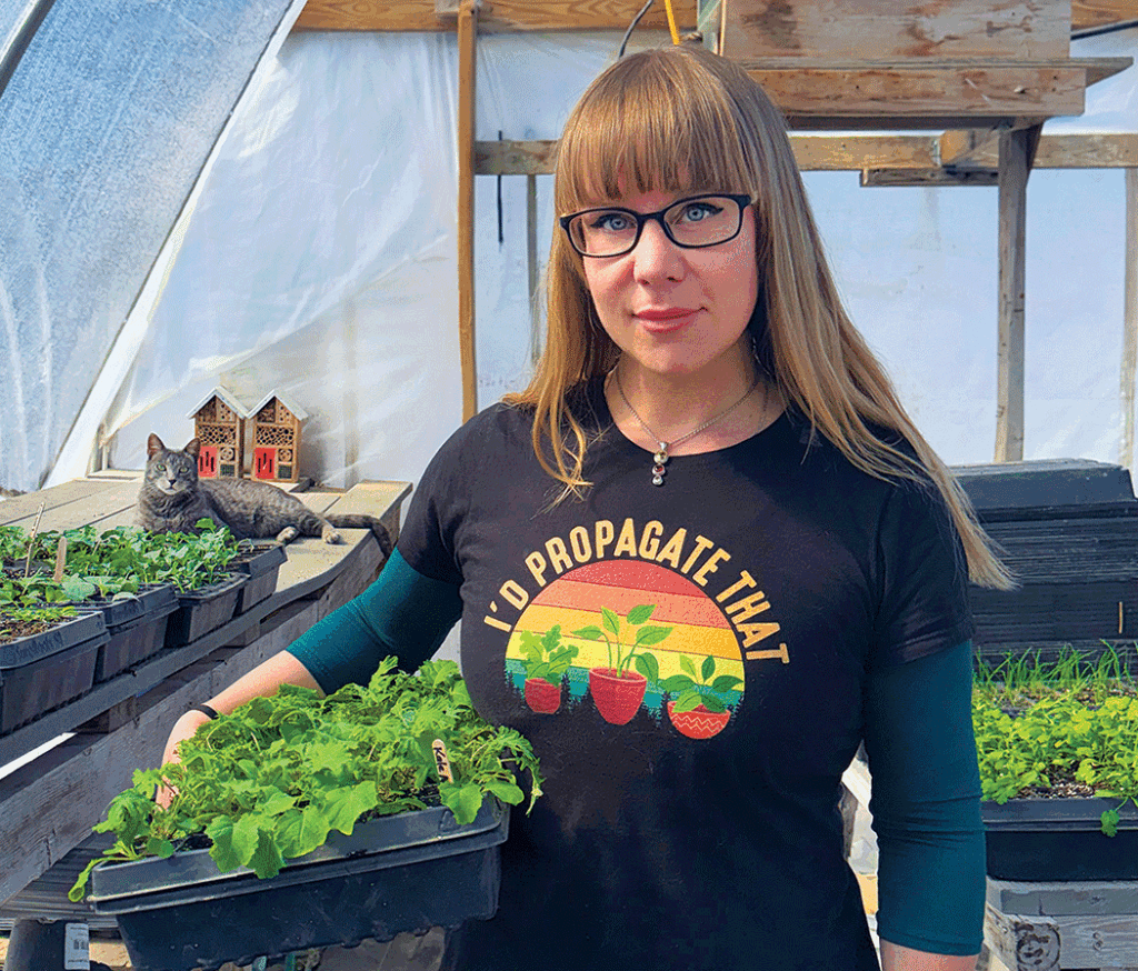 On a chilly spring morning just outside Fairfield, Tiffany April Raines, owner of Wild Spirits Farm, carries trays of seedlings from the bright glow of the grow room into a heated hoop house for transplanting. Flats of kale, broccoli, cabbage, and cilantro sit in rows, ready to be transplanted into larger pots. Blustery winds pick up outside, but the hoop house is calm, filled with warmth from the morning sun.