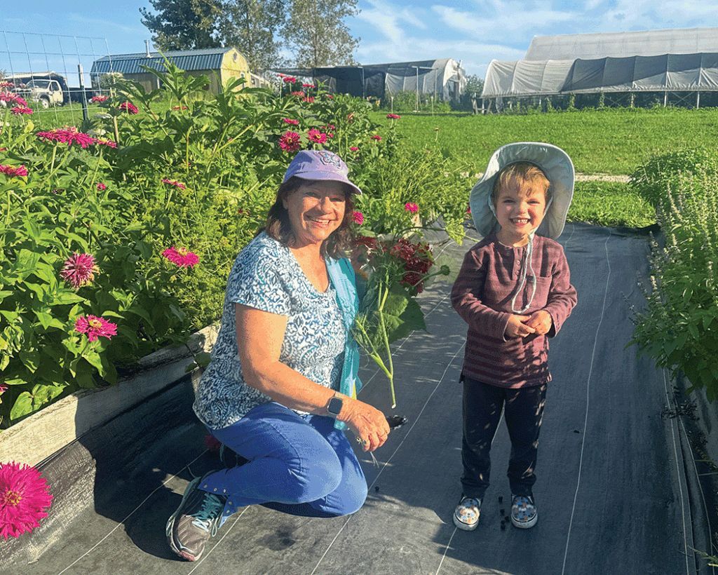 The nursery is only one part of the farm. In addition to the production greenhouse where fresh greens are sprouting, raised garden beds cover about an acre of land. The beds are full of berries, vegetables, herbs, and an abundance of flowers. On Sundays during the summer, the farm opens to the public for a “U-pick” day, although Raines jokingly calls it something different. “Most people aren’t totally comfortable harvesting from the plants out here,” she says. “So I started calling it a ‘U-point.’ People point to what they want and I pick it for them.”